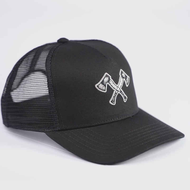 Ergänze Dein Outfit mit der Mesh-Variante unseres Crossed Axes Basecaps mit gesticktem Axt-Logo und dem Timberjacks-Schriftzug an der Seite. Das Mesh ist passend zu Front schwarz. Mit dem verstellbaren Snap-Verschluss kannst Du das Basecap genau an Dich anpassen. Der Button oben auf der Cap ist schwarz und von innen mit einer Metallniete angebracht. Auf der Innenseite ist im Rand ein Schweißband eingenäht und die Panels werden durch Tapings verbunden, auf denen der Timberjacks-Schriftzug steht. Die Front wird durch einen speziellen Buckram in Form gehalten, einem steifen, mesh-artigen Material. Der Schirm ist schwarz, gewölbt und egal ob nach vorn oder hinten getragen- dieses Basecap ist ein echter Hingucker!